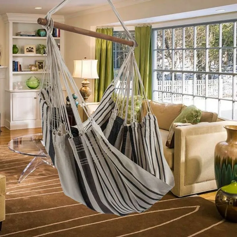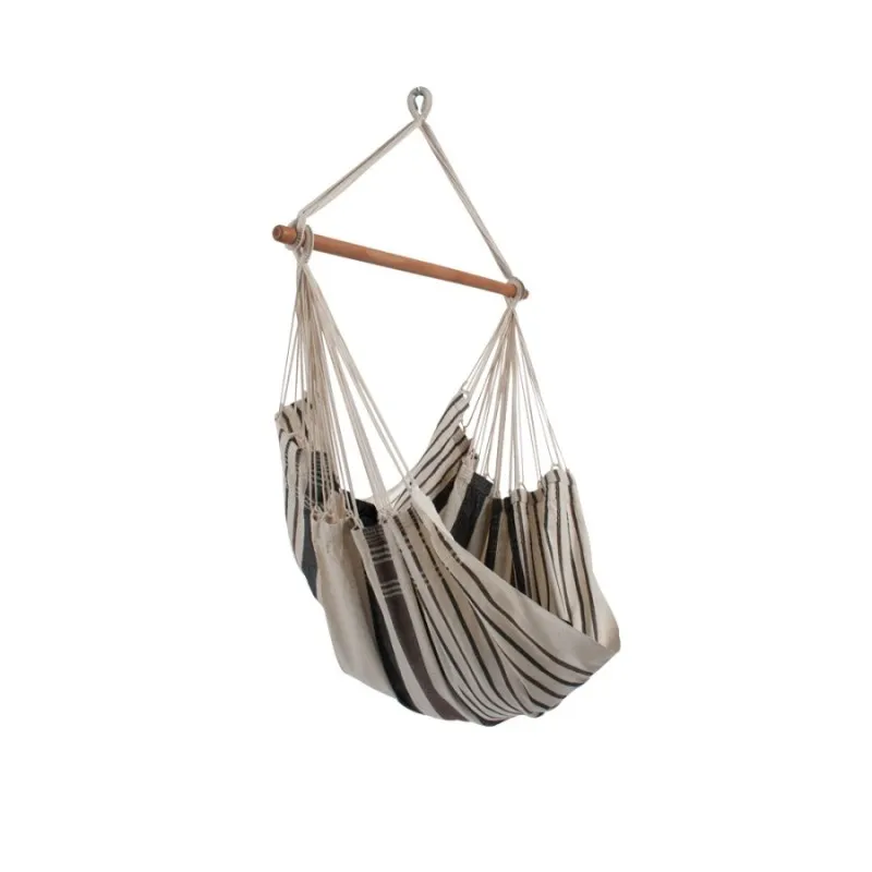 Стильное подвесное кресло. Кресло крепется к деревянной раме прочными веревками и выдерживают нагрузку до 150 кг. Полотно изготовлено из прочной ткани, краски не выцветают и хорошо переносят чистку и стирку, поэтому кресло будет приносить радость комфортного отдыха долгое время. Подвесное кресло легко впишется в любой интерьер и станет любимым местом отдыха.