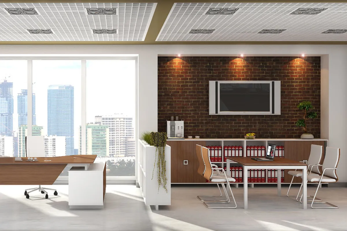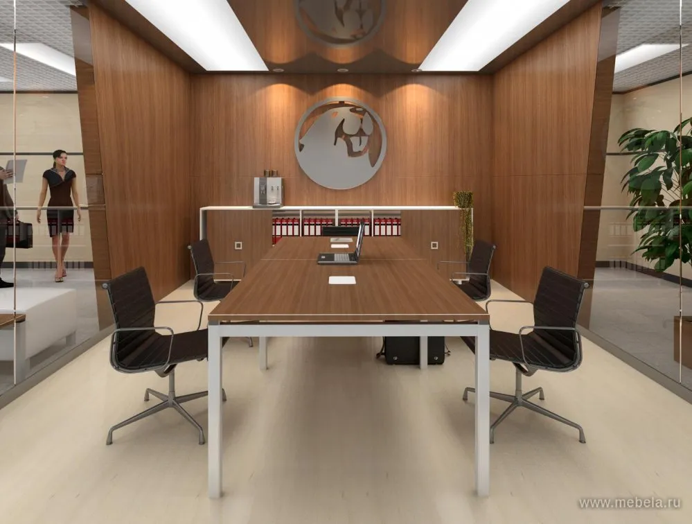 - В составе кабинета присутствует модульная линейка переговорных столов на прямоугольных металлических опорах