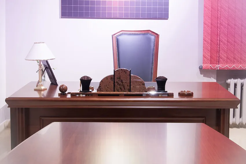 Материал: МДФ . облицованная шпоном американского ореха. Покрытие: натуральный шпон американского ореха, лаковое покрытие,закрытые поры. Материал: бювар стола рабочего и покрытия днищ выдвижных ящиков- искусственная кожа черного цвета. Лицевая фурнитура - ручка-скоба металлическая, цвет под бронзу с чернением по краям.