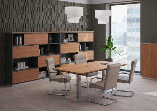 Комбинированные столешницы с нижней частью в цвет корпусов опорных тумб.