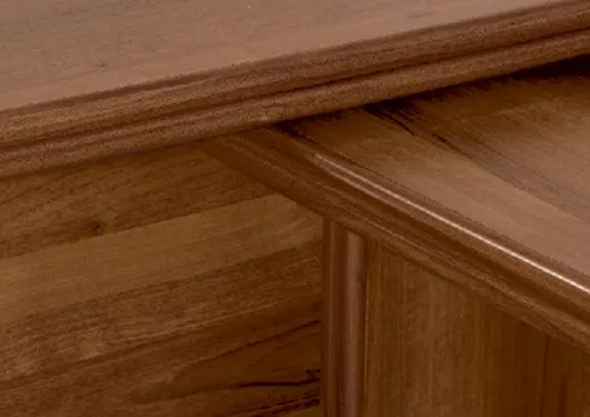Врезной кант из ПВХ с фасонным профилем на столешницах, крышках и топах, декоративные накладки из МДФ на дверях шкафов.