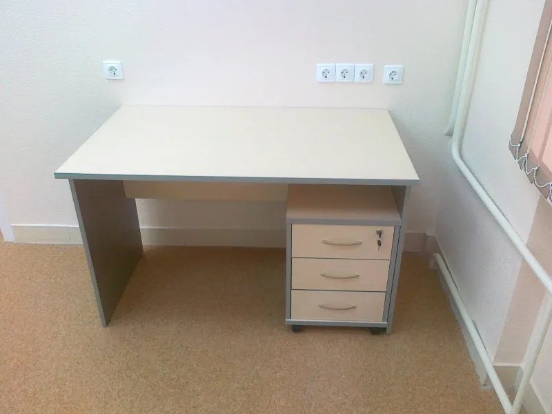 Толщина столешницы 22мм. Толщина опор и каркасов 18 мм. Материал: износоустойчивый ламинат с пропиткой меламиновыми смолами. ДСП класс эмиссии Е1. Защитаа торцевых поверхностей основных элементов: кромка ПВХ, толщина 2 мм. 0,4 мм. Лицевая фурнитура: алюминий. Ящики тумб фолдинг 12 мм. Замки на верхнй ящик. Соединения: эксцентриковые стяжки.