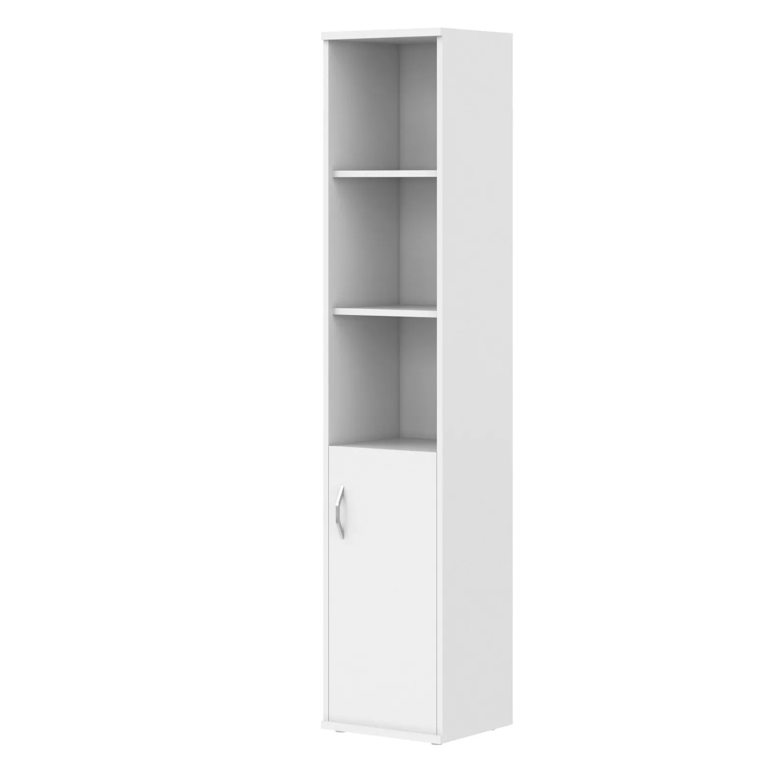 Универсальный шкаф-стеллаж правый IMAGO для офисного или домашнего использования. Размеры - 406х1975х365 мм, цвет - Белый. Оснащен 5 полками, две нижние закрывает дверца из ЛДСП, три верхние - открытые. Шкаф оснащен регулируемыми опорами для компенсации неровностей пола.