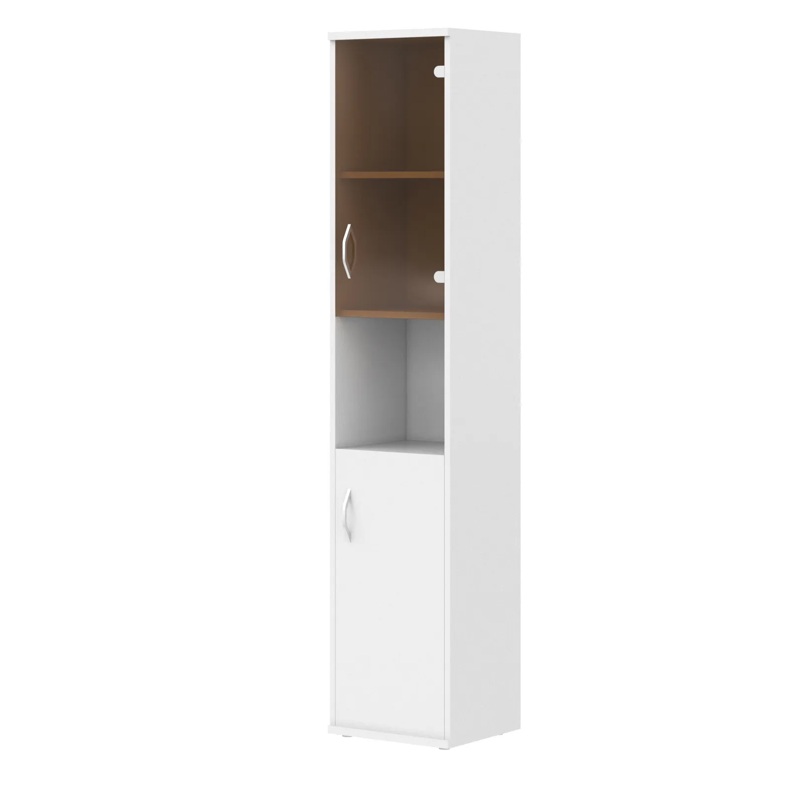 Компактный комбинированный шкаф IMAGO для офисного или домашнего использования. Размеры - 406х1975х365 мм, тип – правосторонний, цвет - белый. Оснащен 5 полками, две нижние полки закрыты дверцей из ЛДСП, две верхние - стекляной дверцей со стильной тонировкой в цвет бронзы. Надежная защита торцевых поверхностей - кромка ПВХ 2 мм. Шкаф оснащен регулируемыми опорами для компенсации неровностей пола.