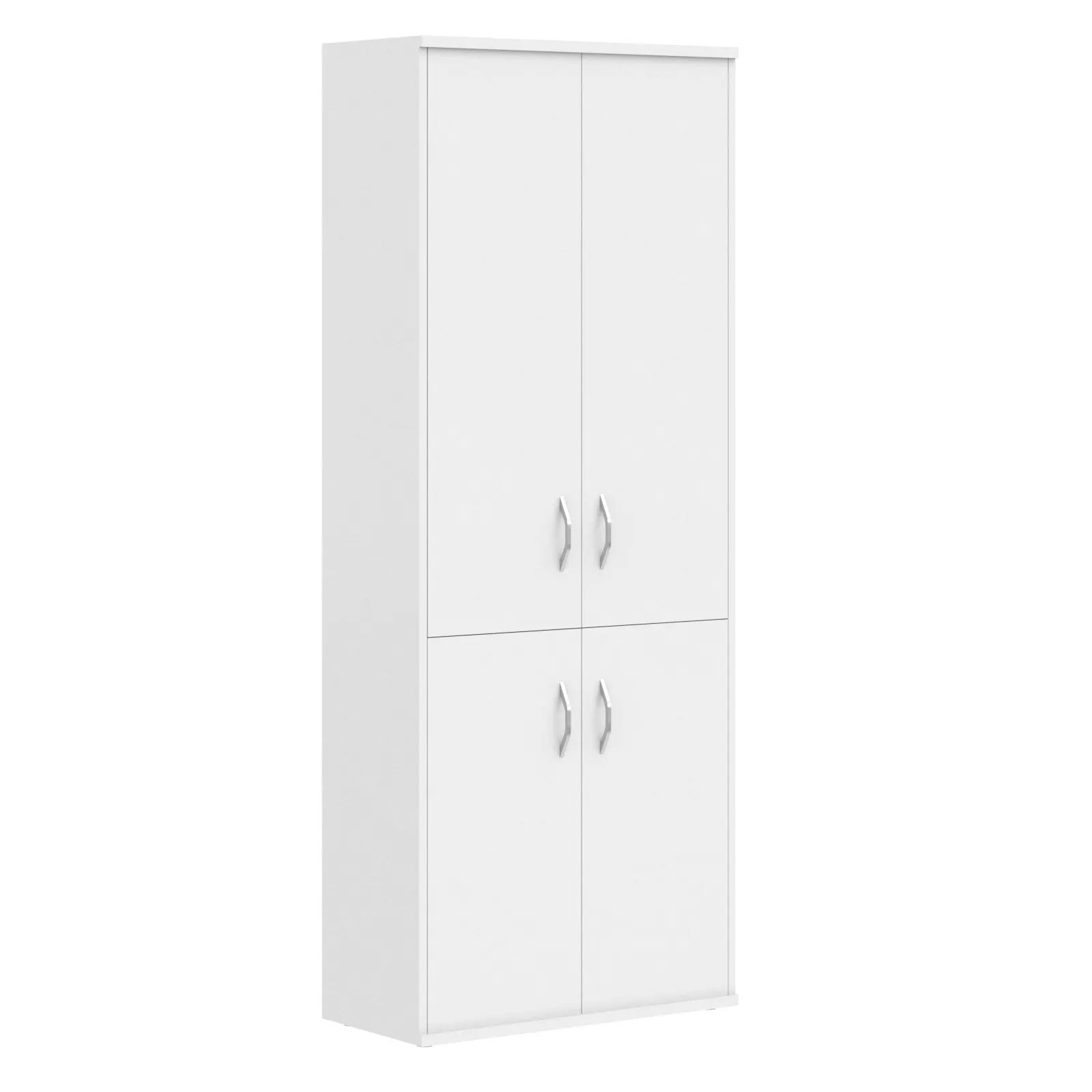 Широкий и высокий шкаф IMAGO для офисного или домашнего использования. Размеры - 770х1975х365 мм, цвет - Белый. Двустворчатый шкаф, для удобства дверцы из ЛДСП разделены на две секции, которые отдельно закрывают три верхние и две нижние полки. Шкаф оснащен регулируемыми опорами для компенсации неровностей пола.