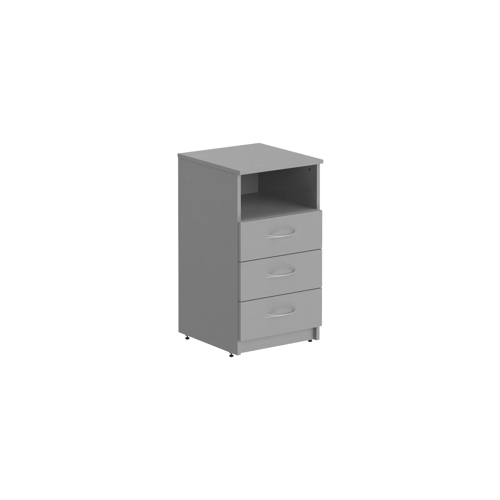 Универсальная приставная тумба SIMPLE для офисного или домашнего использования. Размеры - 407х760х450 мм, цвет – Серый. 3 ящика и одна открытая полка, надежная защита торцевых поверхностей - кромка ПВХ. Возможность регулировки по высоте для неровных полов.