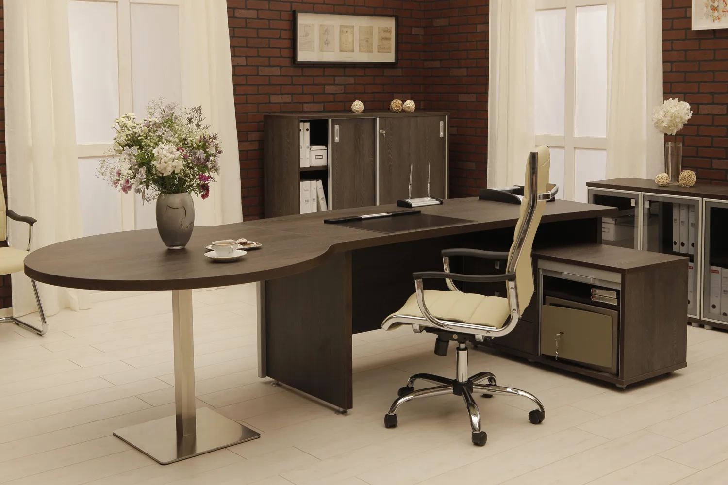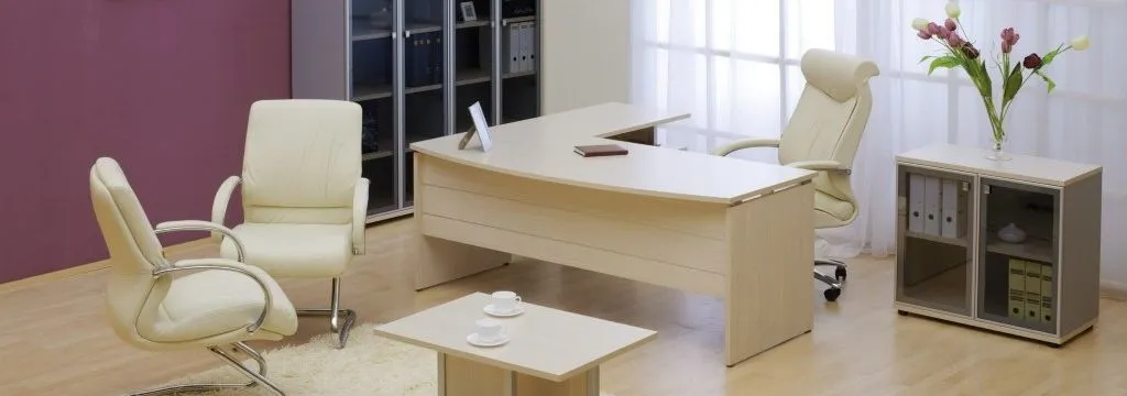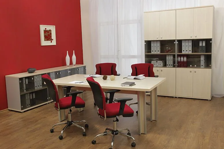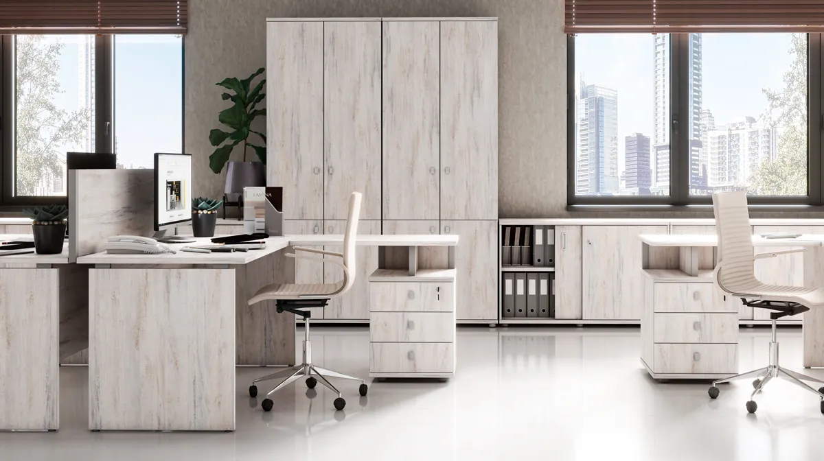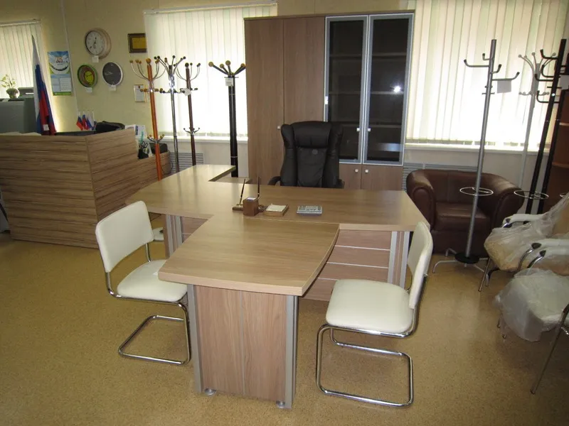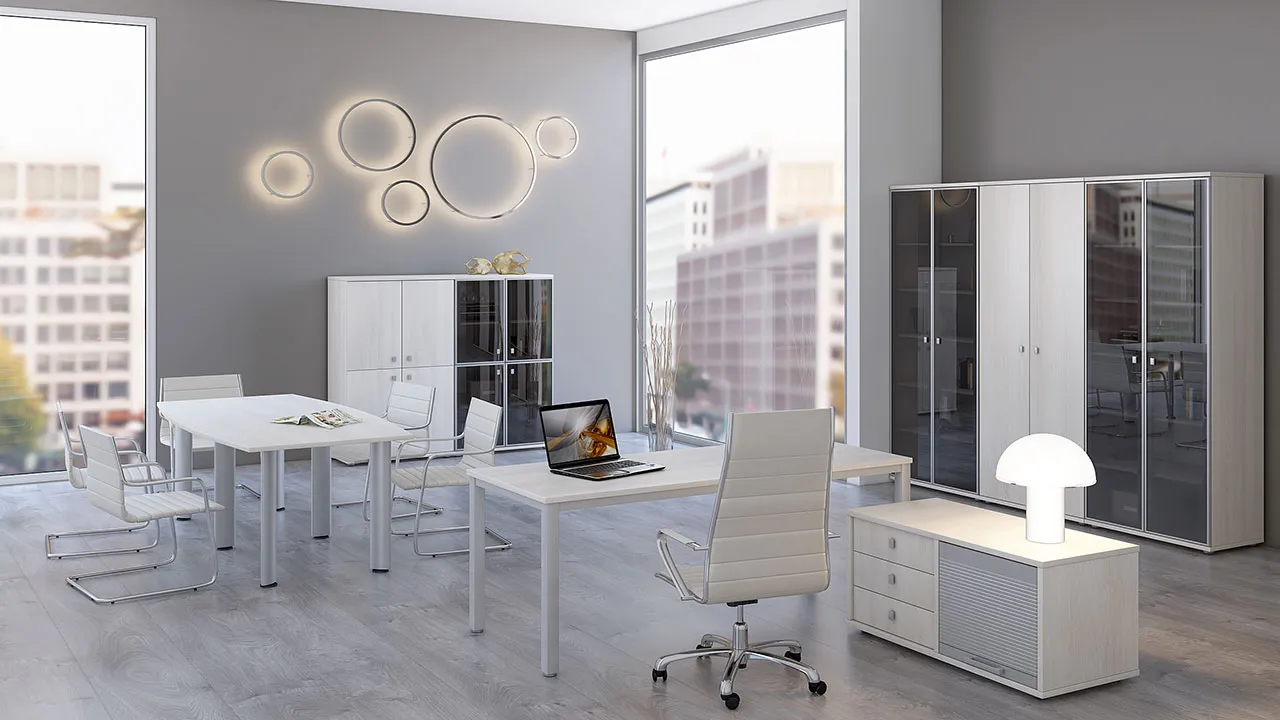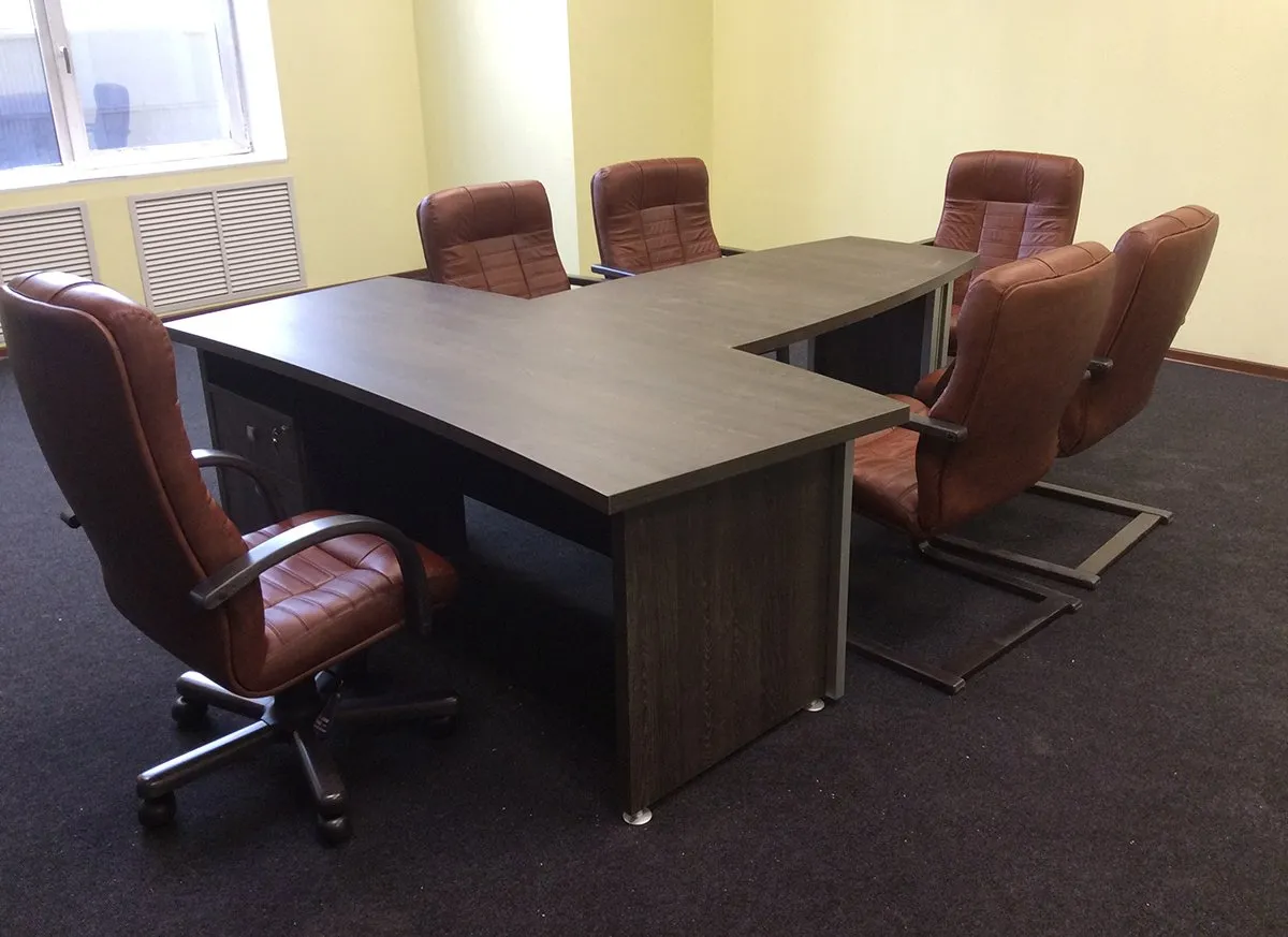 Выполнена из ЛДСП 25 мм. Шкафы имеют 6 полок толщиной 25 мм.Тонированные дымчато-серые стекла в в модном алюминиевом профиле.Столы и тумбы с оригинальными декоративным элементами.