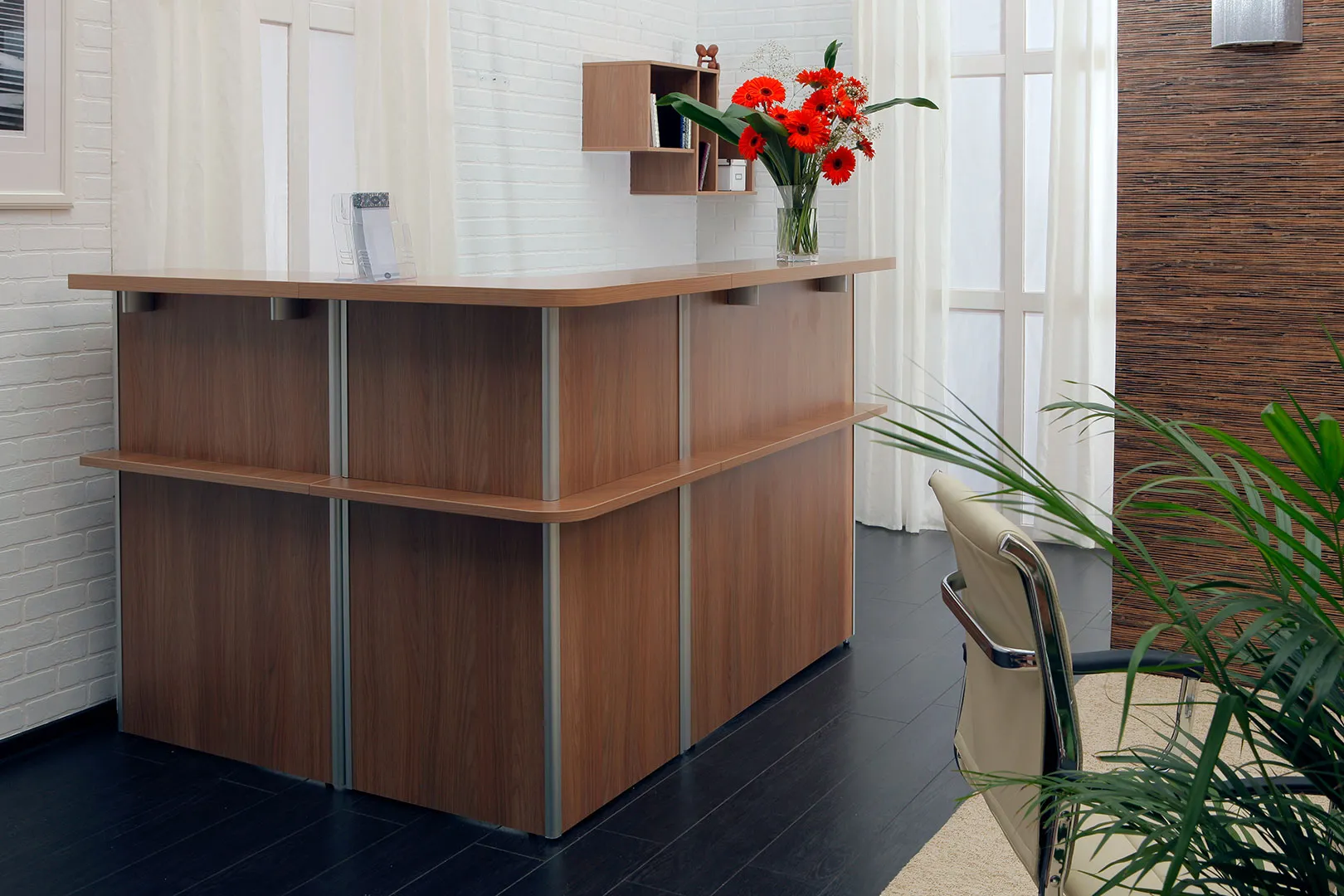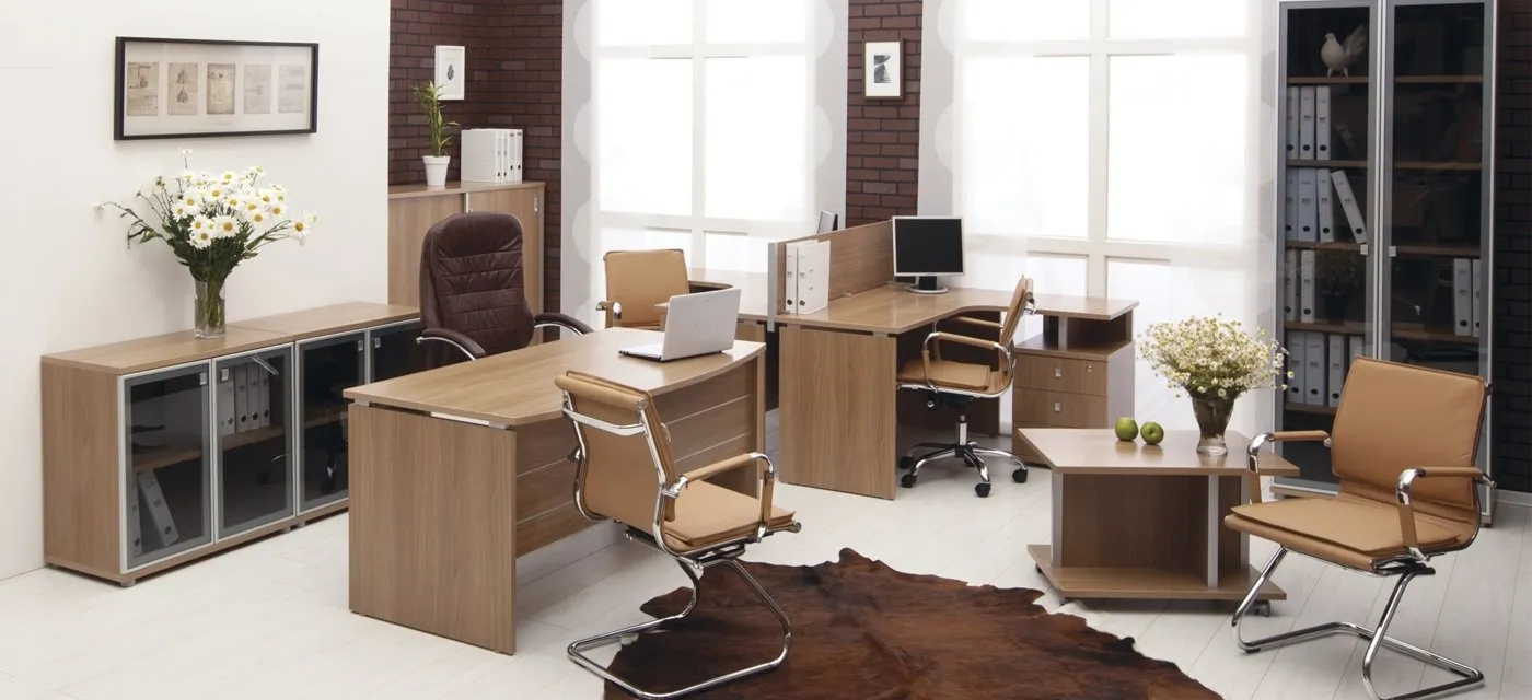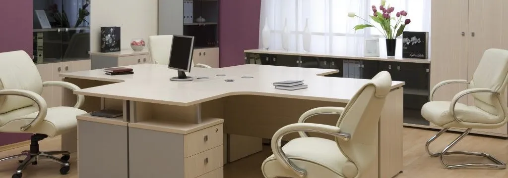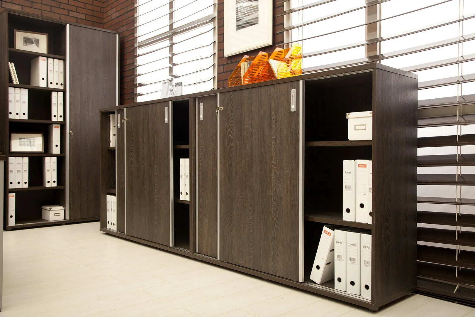 Выполнена из ЛДСП 25 мм. Шкафы имеют 6 полок толщиной 25 мм.Тонированные дымчато-серые стекла в в модном алюминиевом профиле.Столы и тумбы с оригинальными декоративным элементами.