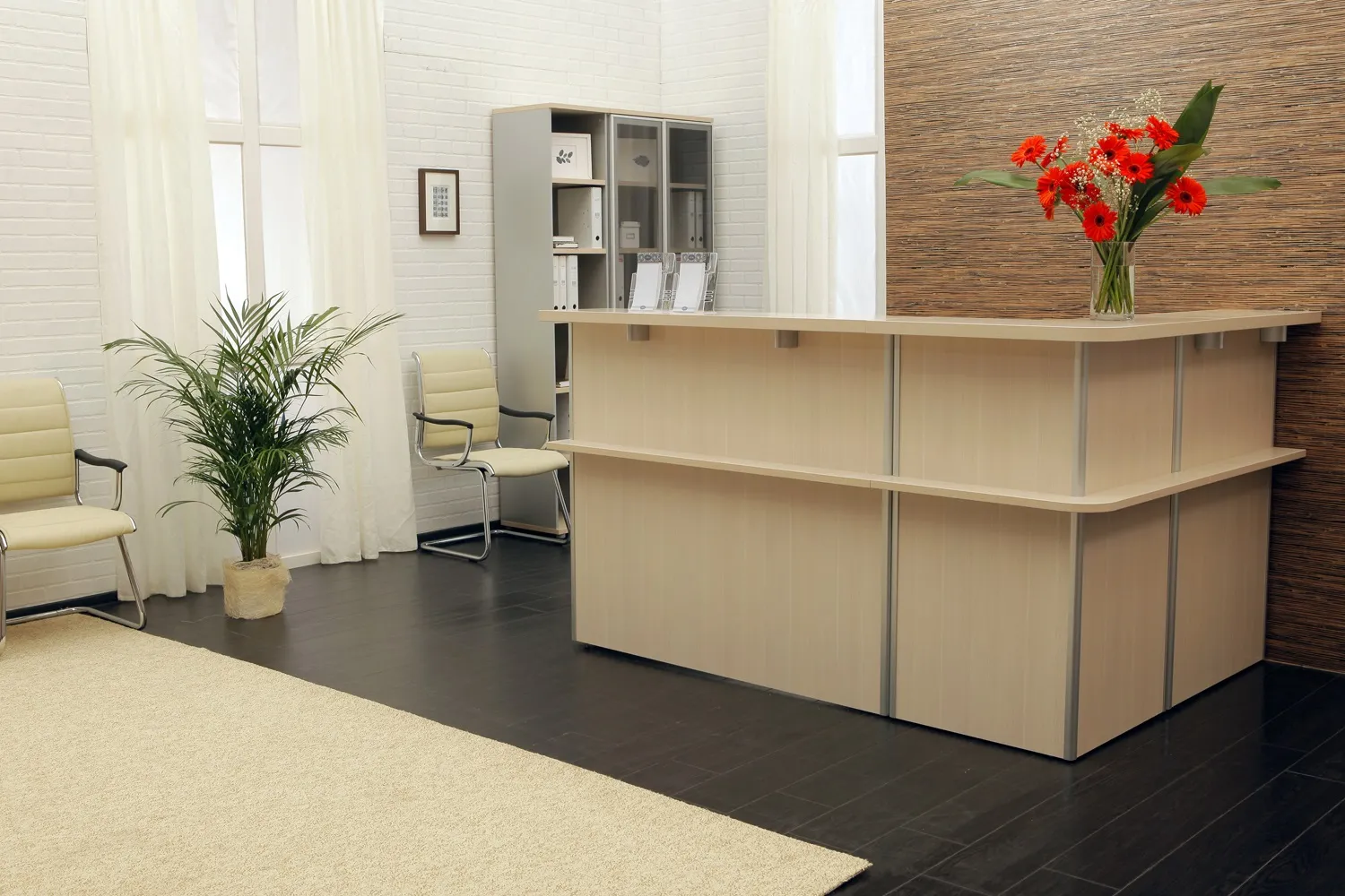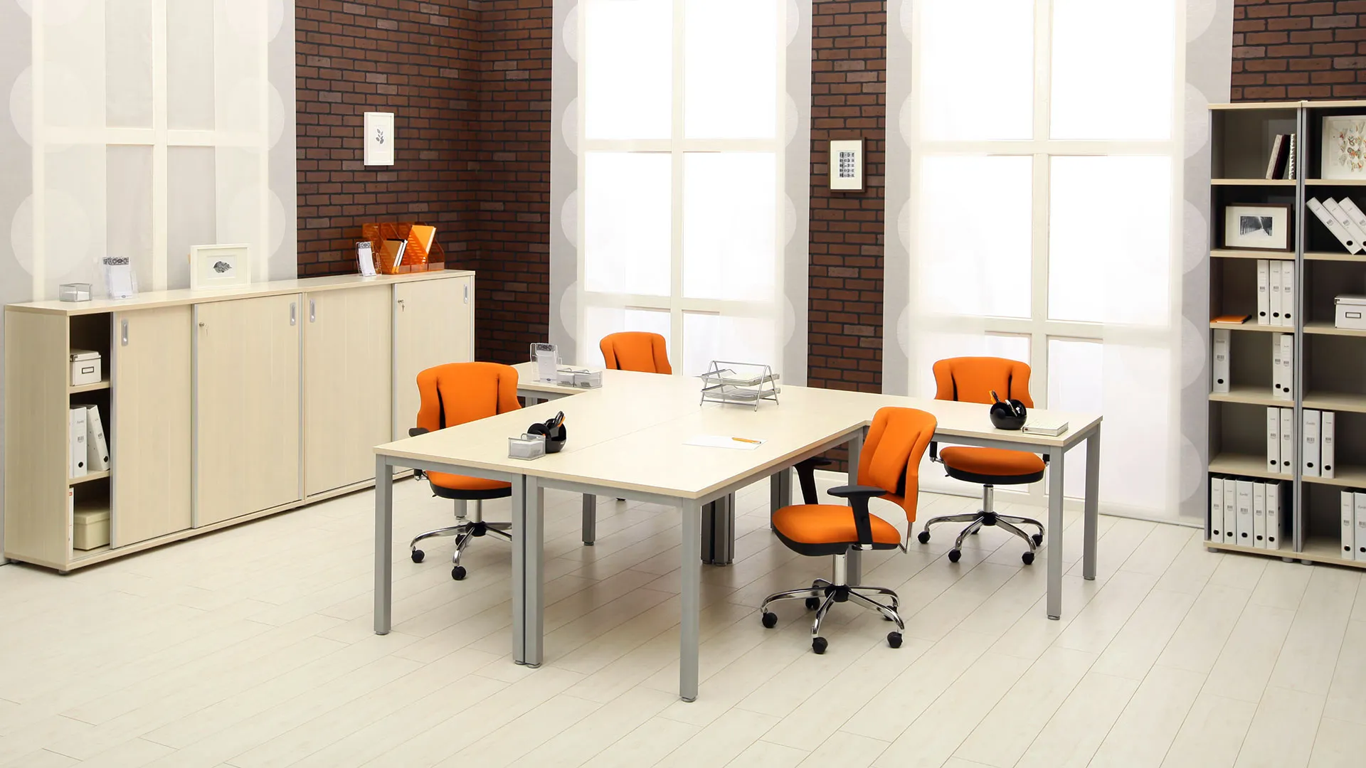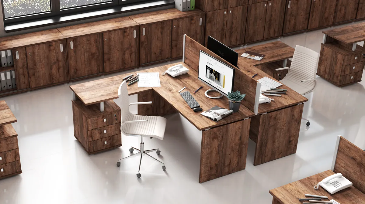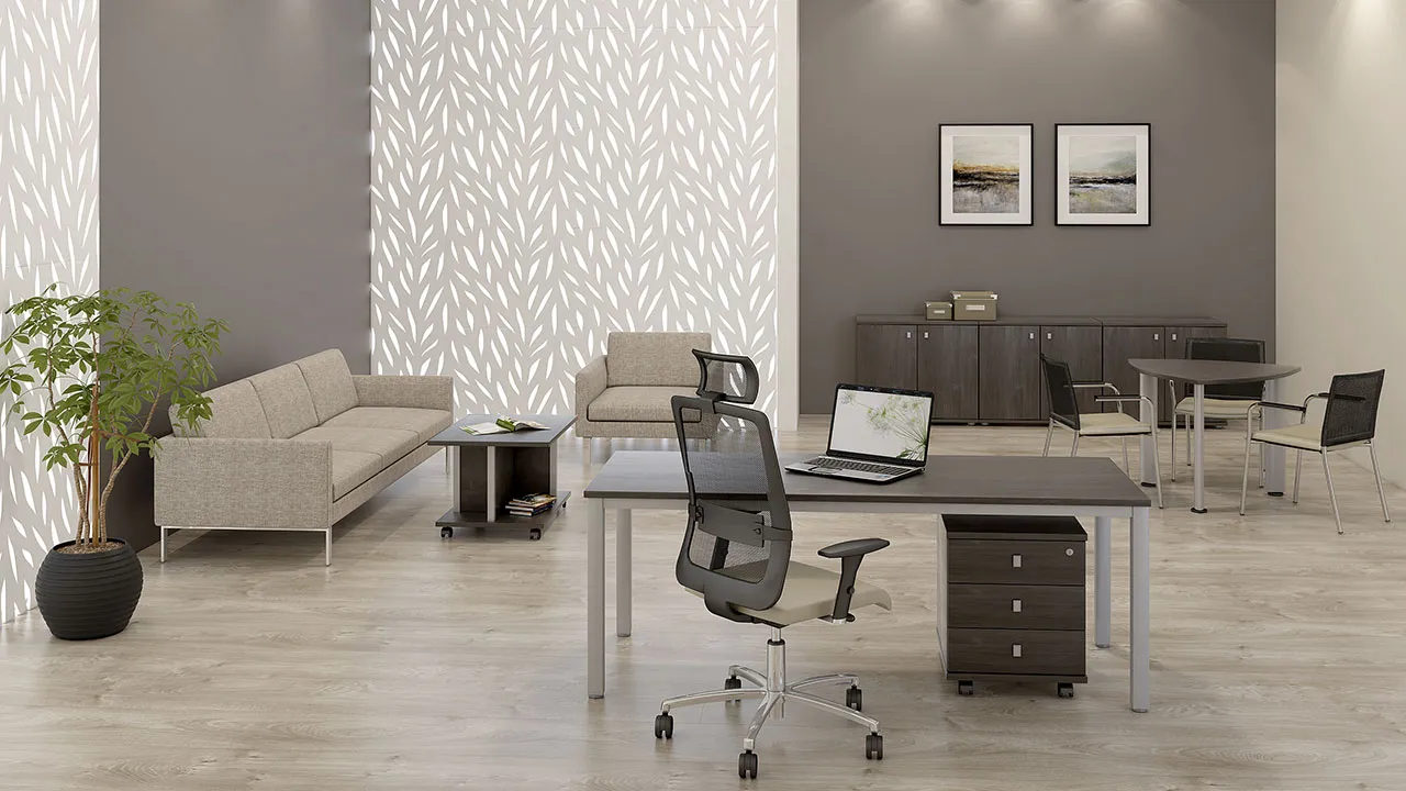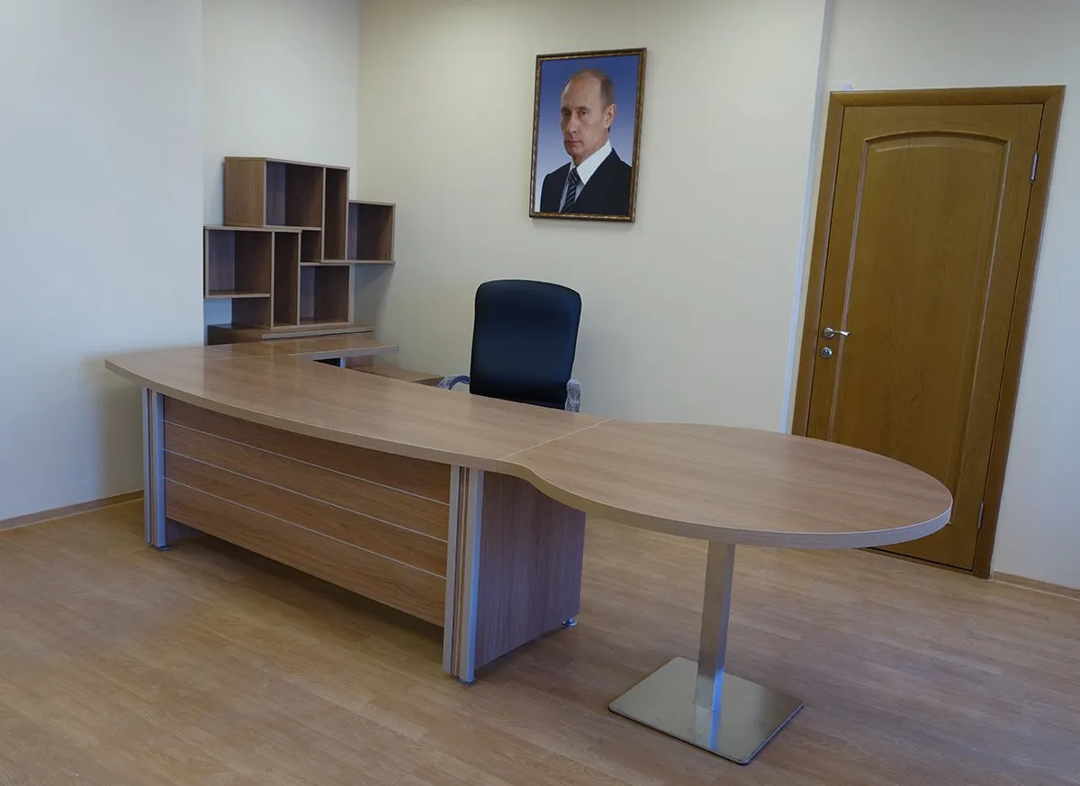 Выполнена из ЛДСП 25 мм. Шкафы имеют 6 полок толщиной 25 мм.Тонированные дымчато-серые стекла в в модном алюминиевом профиле.Столы и тумбы с оригинальными декоративным элементами.