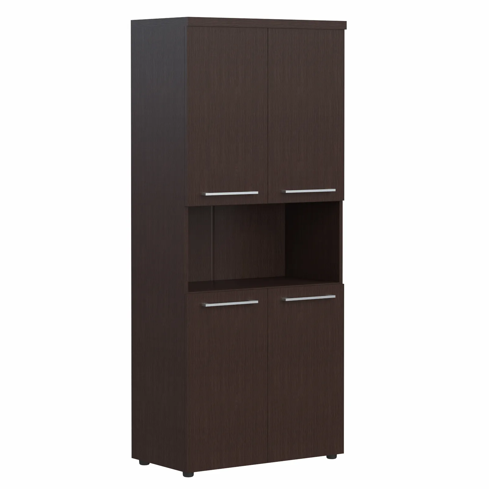Универсальный высокий шкаф-стеллаж ALTO для офисного или домашнего использования. Размеры - 850х1968х456 мм, цвет - Венге Магия. Имеет 5 просторных полочек, нижние 2 и верхние 2 закрыты дверцами из ЛДСП, посередине одна открытая полочка. На дверцах установлены стильные металлические ручки. Конструкция стеллажа оснащена прочными силовыми креплениями – эксцентриковыми стяжками. Все торцы основных элементов надежно защищены кромкой ПВХ – 2 мм. Солидные и долговечные опоры регулируются по высоте, что придаст стеллажу устойчивость на неровном полу.