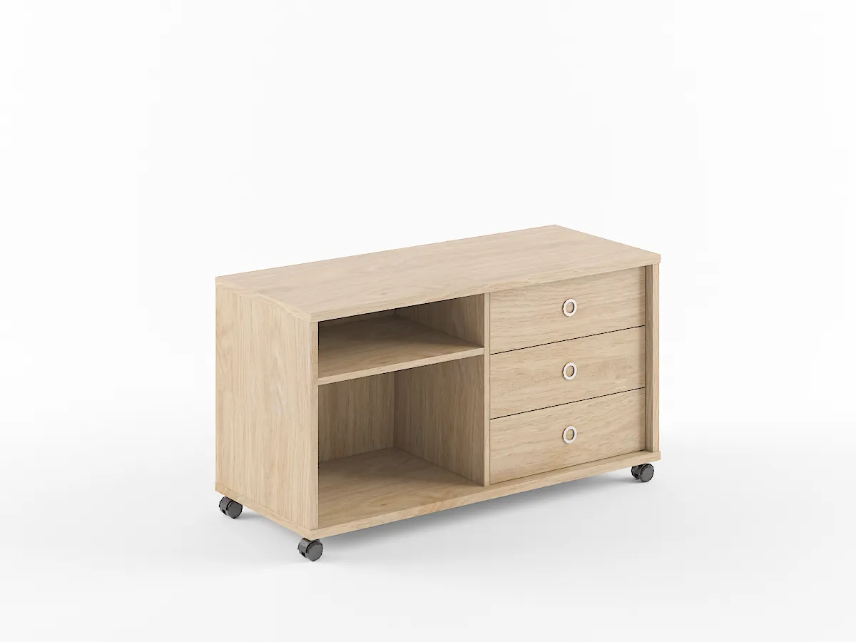 Универсальная сервисная тумба BORN для офисного или домашнего использования. Размеры - 1200х660х500 мм, цвет - Дуб Девон. Тумба разделена на две части, с одной стороны она оснащена ящиками, с другой – открытыми полочками. Количество ящиков – 3, количество полочек – 2. Ящики тумбы декорированы стильными круглыми металлическими ручками. Конструкция тумбы оснащена прочными силовыми креплениями – эксцентриковыми стяжками. Все торцы основных элементов тумбы надежно защищены кромкой ПВХ – 2 мм. Удобные колесики с плавным ходом.
