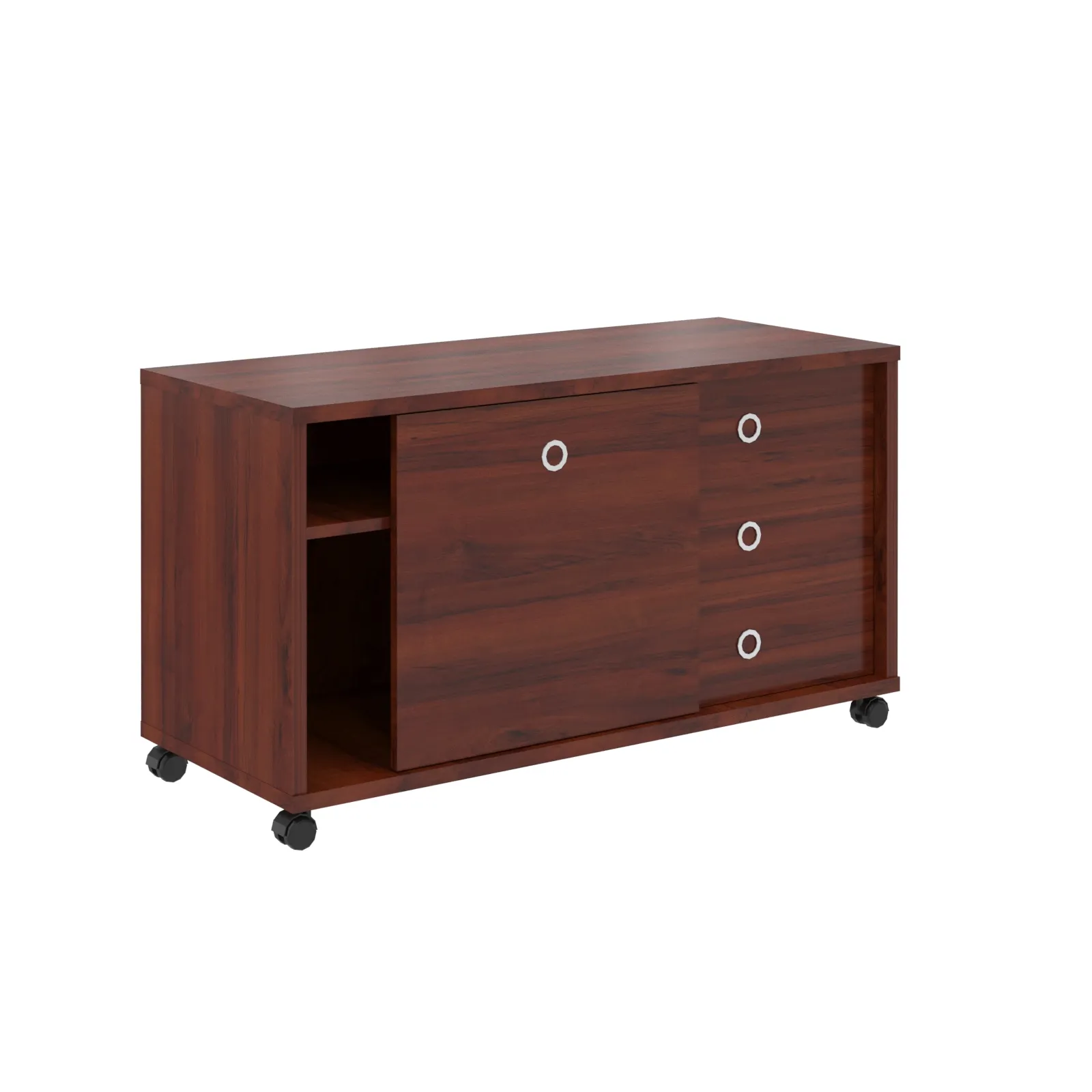 Универсальная сервисная тумба BORN для офисного или домашнего использования. Размеры - 1200х660х500 мм, цвет - Бургунди. Тумба разделена на две части, с одной стороны она оснащена ящиками, с другой – полочками, которые закрываются раздвижной дверцей из ЛДСП под цвет конструкции. Количество ящиков – 3, количество полочек – 2. Ящики тумбы и дверца декорированы стильными круглыми металлическими ручками. Конструкция тумбы оснащена прочными силовыми креплениями – эксцентриковыми стяжками. Все торцы основных элементов тумбы надежно защищены кромкой ПВХ – 2 мм. Удобные колесики с плавным ходом.
