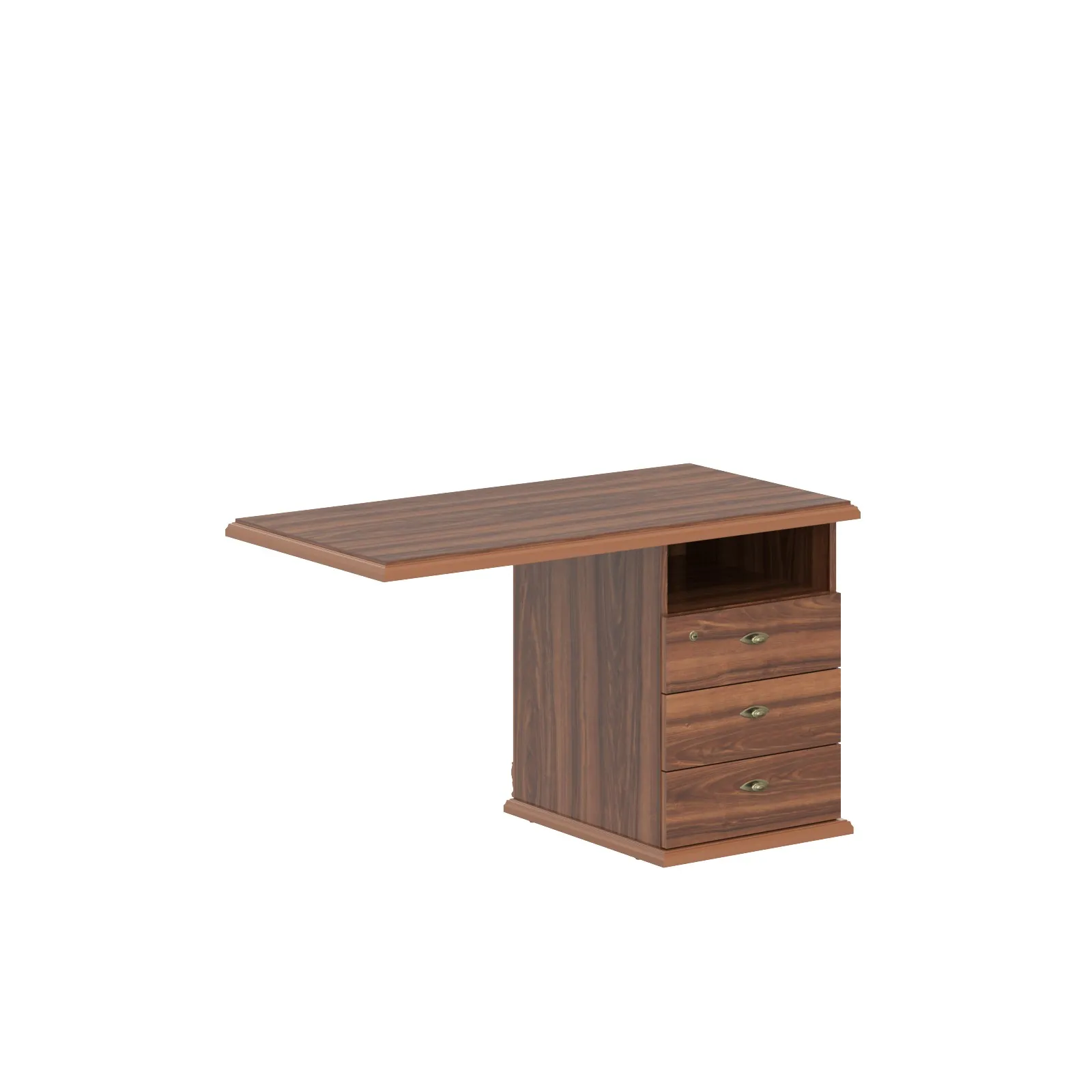 Универсальная приставная тумба RAUT для офисного или домашнего использования, размер - 1200х710х600 мм, цвет – Орех Даллас. Тумба имеет 3 ящика и одну открытую полочку. На каждом ящике установлена стильная металлическая ручка. Верх оснащен солидной столешницей из МДФ 30 мм, которую обрамляет массивная ступенчатая рама. Основание тумбы имеет эффектное расширение. Надежная защита всех элементов из ЛДСП – кромка ПВХ. Конструкция тумбы оснащена прочными силовыми креплениями – эксцентриковыми стяжками. Регулируемые по высоте опоры обеспечат тумбе устойчивость на неровном полу.