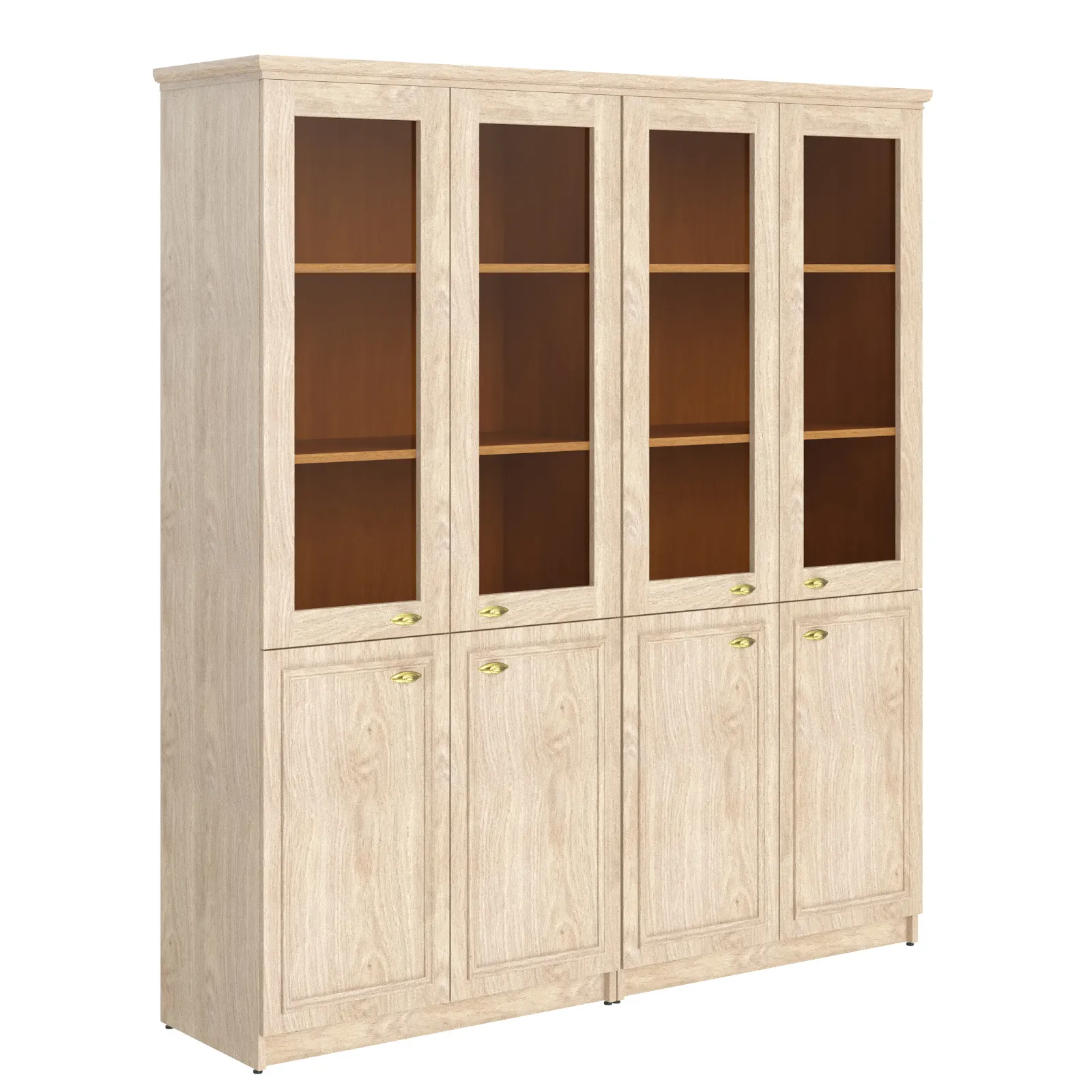 Большой комбинированный шкаф RAUT для офисного или домашнего использования, размер - 1808х2023х466 мм, цвет – Дуб Девон. Двойной двустворчатый шкаф оснащенный 5 полками, 2 нижние закрываются дверцами из ЛДСП под цвет конструкции, три верхние – стеклянными дверцами. На всех дверцах установлены стильные металлические ручки. Верх оснащен солидным топом из МДФ 30 мм, который обрамляет массивная ступенчатая рама. Фасады обрамлены декоративными накладками из МДФ. Надежная защита всех элементов из ЛДСП – кромка ПВХ. Конструкция шкафа оснащена прочными силовыми креплениями – эксцентриковыми стяжками. Регулируемые по высоте опоры обеспечат устойчивость на неровном полу.