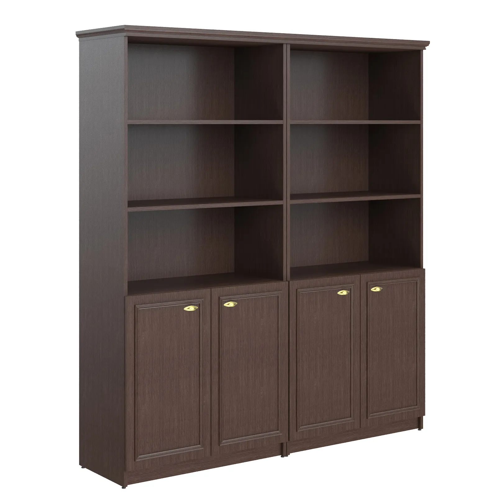 Большой шкаф-стеллаж RAUT для офисного или домашнего использования, размер - 1808х2023х466 мм, цвет – Венге Магия. Двойной шкаф оснащенный 5 полками, 2 нижние закрываются дверцами из ЛДСП под цвет конструкции, три верхние – открытые. На дверцах установлены стильные металлические ручки. Верх оснащен солидным топом из МДФ 30 мм, который обрамляет массивная ступенчатая рама. Фасады обрамлены декоративными накладками из МДФ. Надежная защита всех элементов из ЛДСП – кромка ПВХ. Конструкция шкафа оснащена прочными силовыми креплениями – эксцентриковыми стяжками. Регулируемые по высоте опоры обеспечат устойчивость на неровном полу.