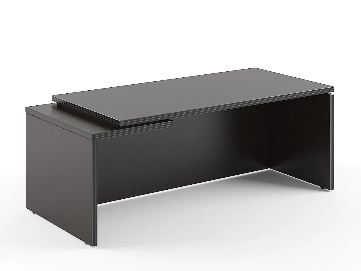 Солидный и большой рабочий стол руководителя TORR для офисного или домашнего использования, размер - 1800х900х750 мм, тип – левосторонний, цвет – Венге Магия. Оснащен надежными и долговечными опорами увеличенной ширины из ЛДСП 38 мм, которые расположены по краям стола. Между столешницей и опорами установлены специальные проставки, что создает эффект «парящей столешницы». Солидная и прочная столешница 38 мм. Все торцевые поверхности основных элементов стола облицованы глянцевой акриловой кромкой 2 мм с декоративными полосками внутри кромки, что придает ей стильный 3D эффект. Торцы дополнительных элементов надежно защищены кромкой ПВХ 2 мм. Конструкция стола оснащена прочными силовыми креплениями – эксцентриковыми стяжками. Регулируемые по высоте опоры обеспечат столу устойчивость на неровном полу.
