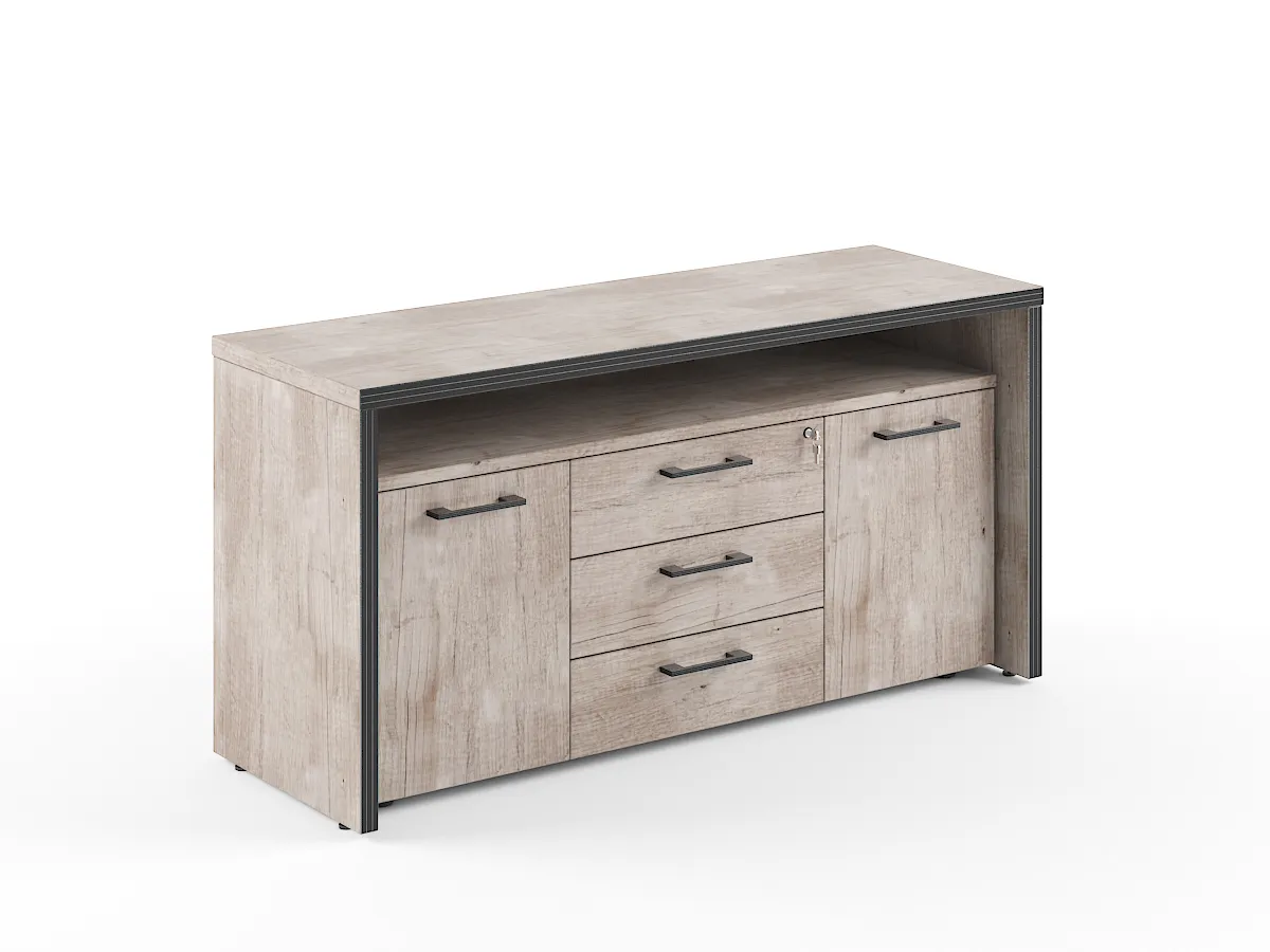 Современная тумба с фригобаром TORR для офисного или домашнего использования, размер - 1640х800х550 мм, цвет – Дуб Каньон. Тумба имеет солидный верхний топ 38 мм. Все торцевые поверхности основных элементов тумбы облицованы глянцевой акриловой пленкой 2 мм с декоративными полосками внутри кромки, что придает ей стильный 3D эффект. Торцы дополнительных элементов надежно защищены кромкой ПВХ 2 мм. Тумба оснащена 3 ящиками с центральным замком и двумя боковыми секциями предназначенными для фригобара. Конструкция тумбы оснащена прочными силовыми креплениями – эксцентриковыми стяжками. Регулируемые по высоте опоры обеспечат тумбе устойчивость на неровном полу.