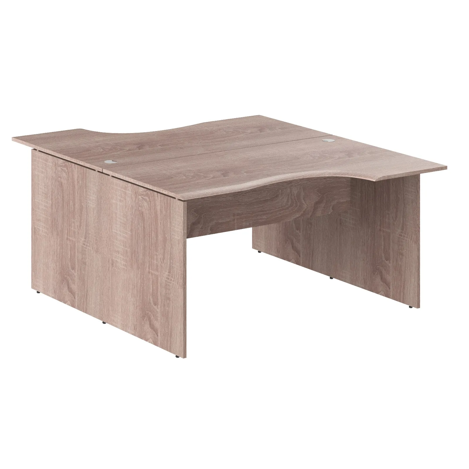 Универсальная рабочая станция на 2 рабочих места WAVE для офисного или домашнего использования, размер – 1400х1800х750 мм, цвет – Дуб Сонома. Оснащена надежными и долговечными опорами из ЛДСП 18 мм, которые расположены по краям стола. Между столешницей и опорами установлены специальные проставки, что создает эффект «парящей столешницы». Солидная и прочная столешница из МДФ 19 мм оригинальной эргономичной формы, в которой установлены 2 кабель-канала с декоративными заглушками. Столешницы можно разделить с помощью перегородки, что позволит создать изолированные рабочие места. Фрезерованные края столешниц гарантируют отсутствие острых углов, благодаря чему работать за ними комфортно, а плавные линии придают дизайну «объемный» вид. Надежная защита торцов всех элементов из ЛДСП - кромка ПВХ. Конструкция стола оснащена прочными силовыми креплениями – эксцентриковыми стяжками. Регулируемые по высоте опоры обеспечат столу устойчивость на неровном полу.