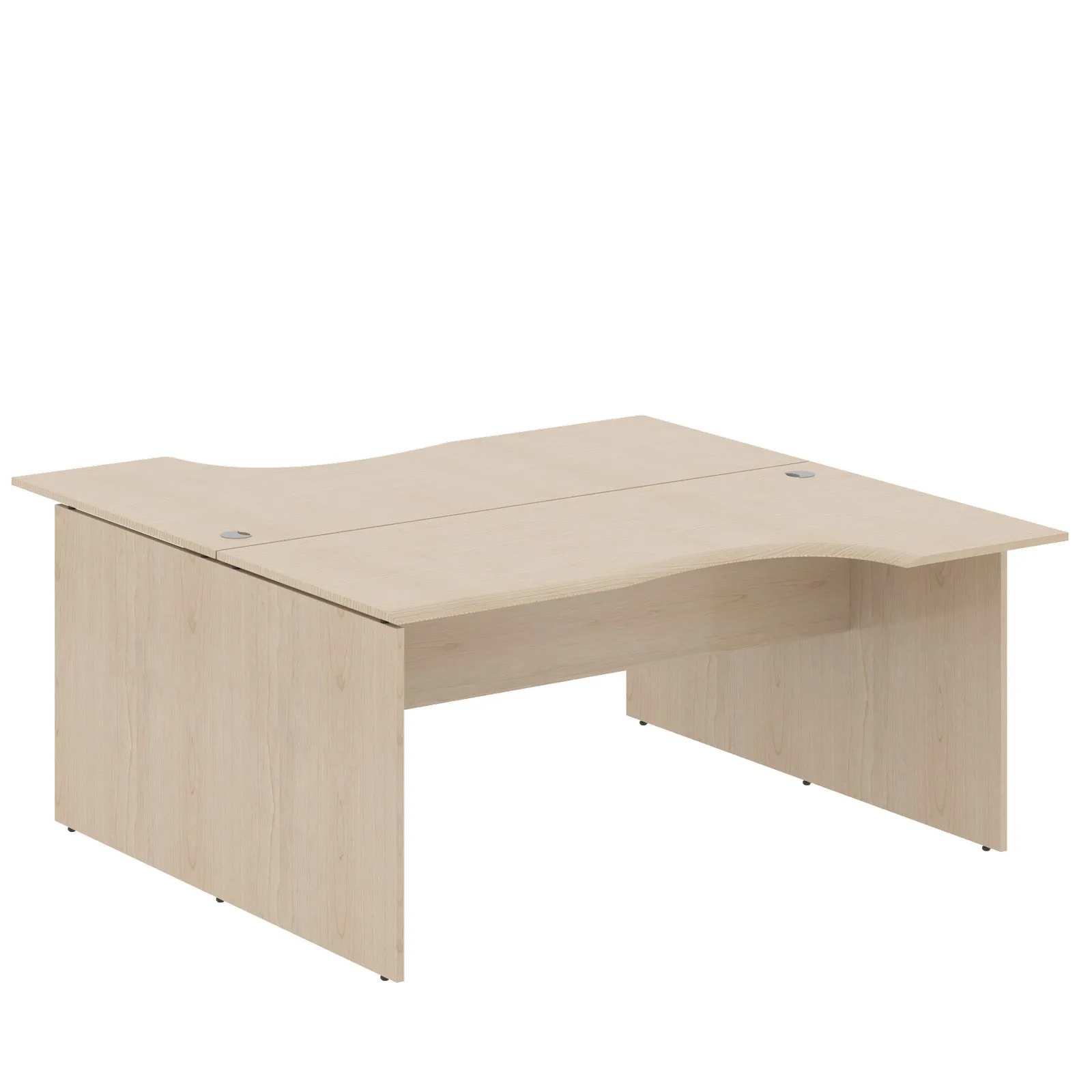 Большая рабочая станция на 2 рабочих места WAVE для офисного или домашнего использования, размер – 1600х1800х750 мм, цвет – Бук Тиара. Оснащена надежными и долговечными опорами из ЛДСП 18 мм, которые расположены по краям стола. Между столешницей и опорами установлены специальные проставки, что создает эффект «парящей столешницы». Солидная и прочная столешница из МДФ 19 мм оригинальной эргономичной формы, в которой установлены 2 кабель-канала с декоративными заглушками. Столешницы можно разделить с помощью перегородки, что позволит создать изолированные рабочие места. Фрезерованные края столешниц гарантируют отсутствие острых углов, благодаря чему работать за ними комфортно, а плавные линии придают дизайну «объемный» вид. Надежная защита торцов всех элементов из ЛДСП - кромка ПВХ. Конструкция стола оснащена прочными силовыми креплениями – эксцентриковыми стяжками. Регулируемые по высоте опоры обеспечат столу устойчивость на неровном полу.