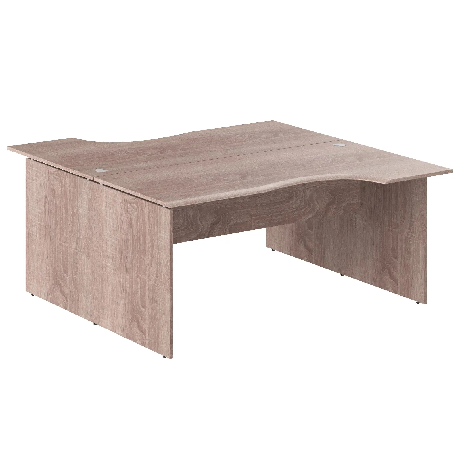 Большая рабочая станция на 2 рабочих места WAVE для офисного или домашнего использования, размер – 1600х1800х750 мм, цвет – Дуб Сонома. Оснащена надежными и долговечными опорами из ЛДСП 18 мм, которые расположены по краям стола. Между столешницей и опорами установлены специальные проставки, что создает эффект «парящей столешницы». Солидная и прочная столешница из МДФ 19 мм оригинальной эргономичной формы, в которой установлены 2 кабель-канала с декоративными заглушками. Столешницы можно разделить с помощью перегородки, что позволит создать изолированные рабочие места. Фрезерованные края столешниц гарантируют отсутствие острых углов, благодаря чему работать за ними комфортно, а плавные линии придают дизайну «объемный» вид. Надежная защита торцов всех элементов из ЛДСП - кромка ПВХ. Конструкция стола оснащена прочными силовыми креплениями – эксцентриковыми стяжками. Регулируемые по высоте опоры обеспечат столу устойчивость на неровном полу.
