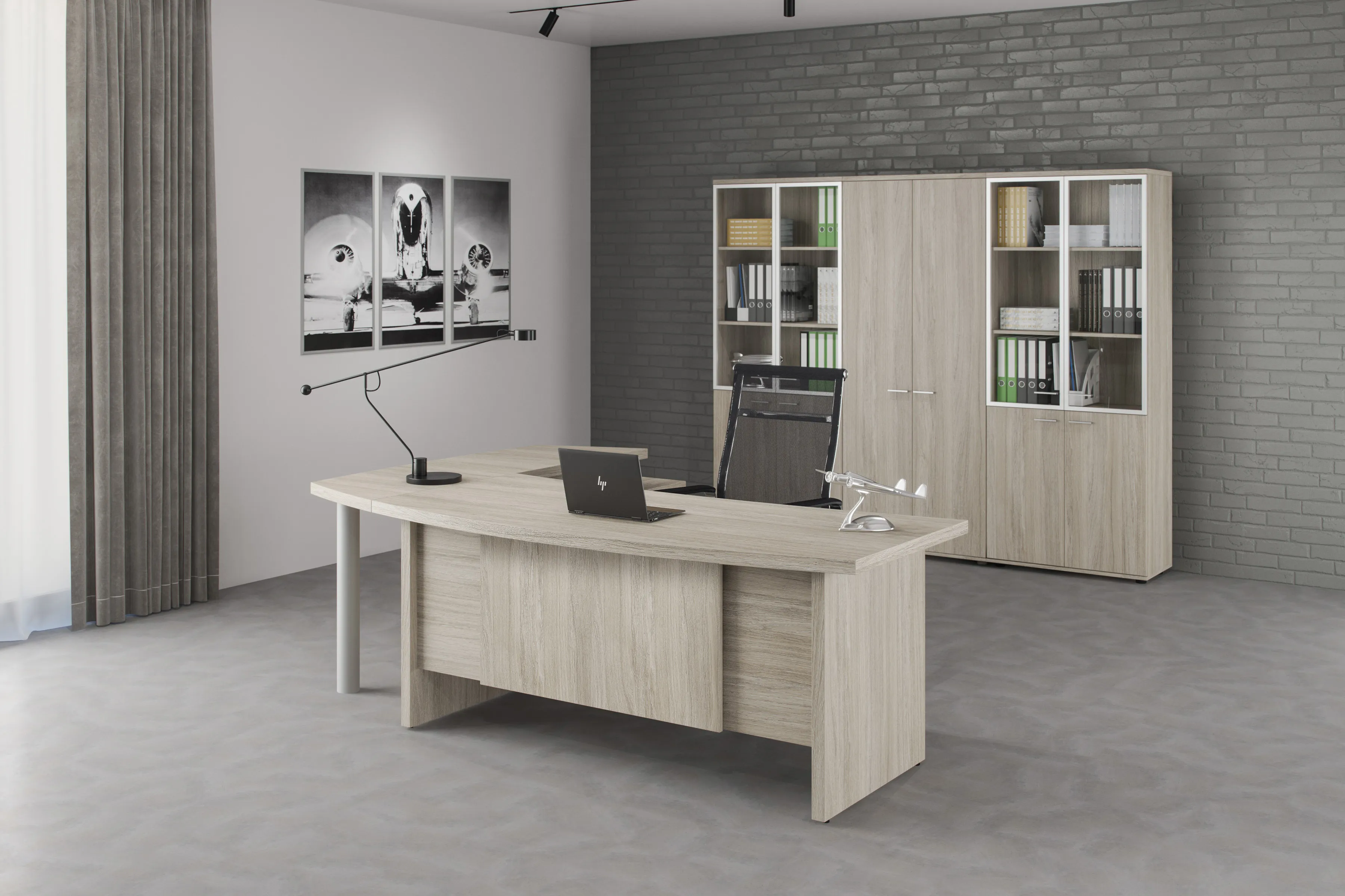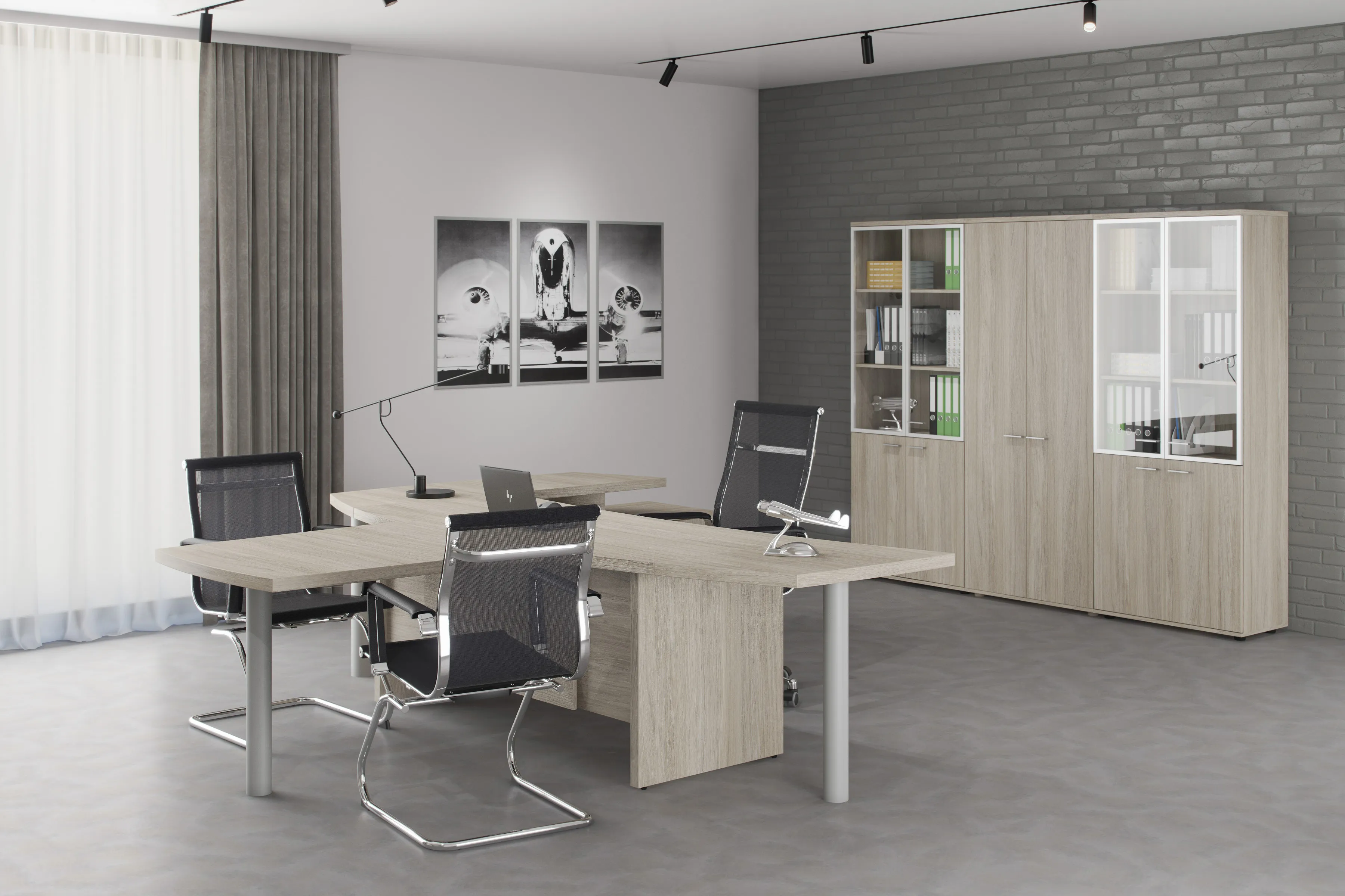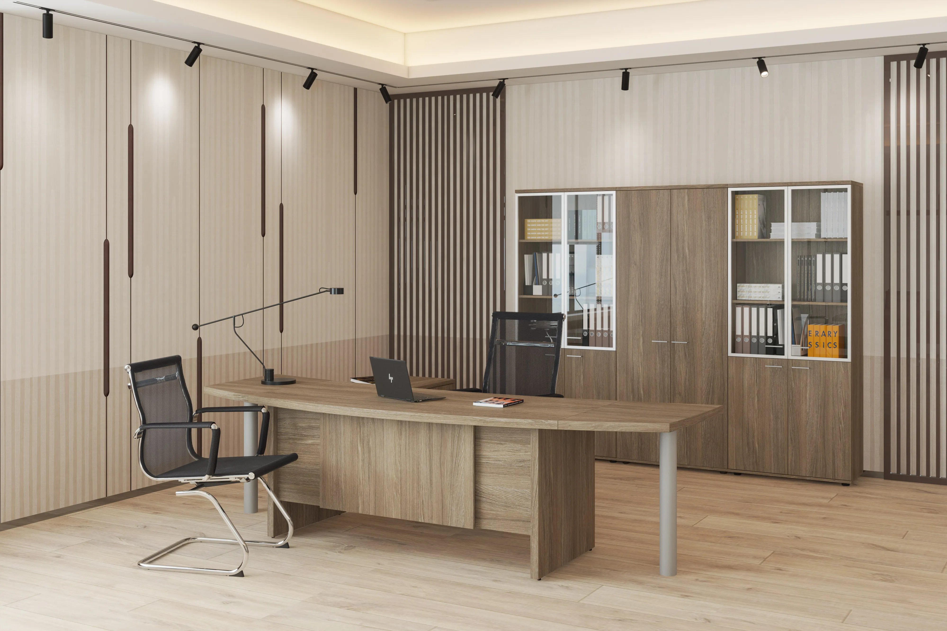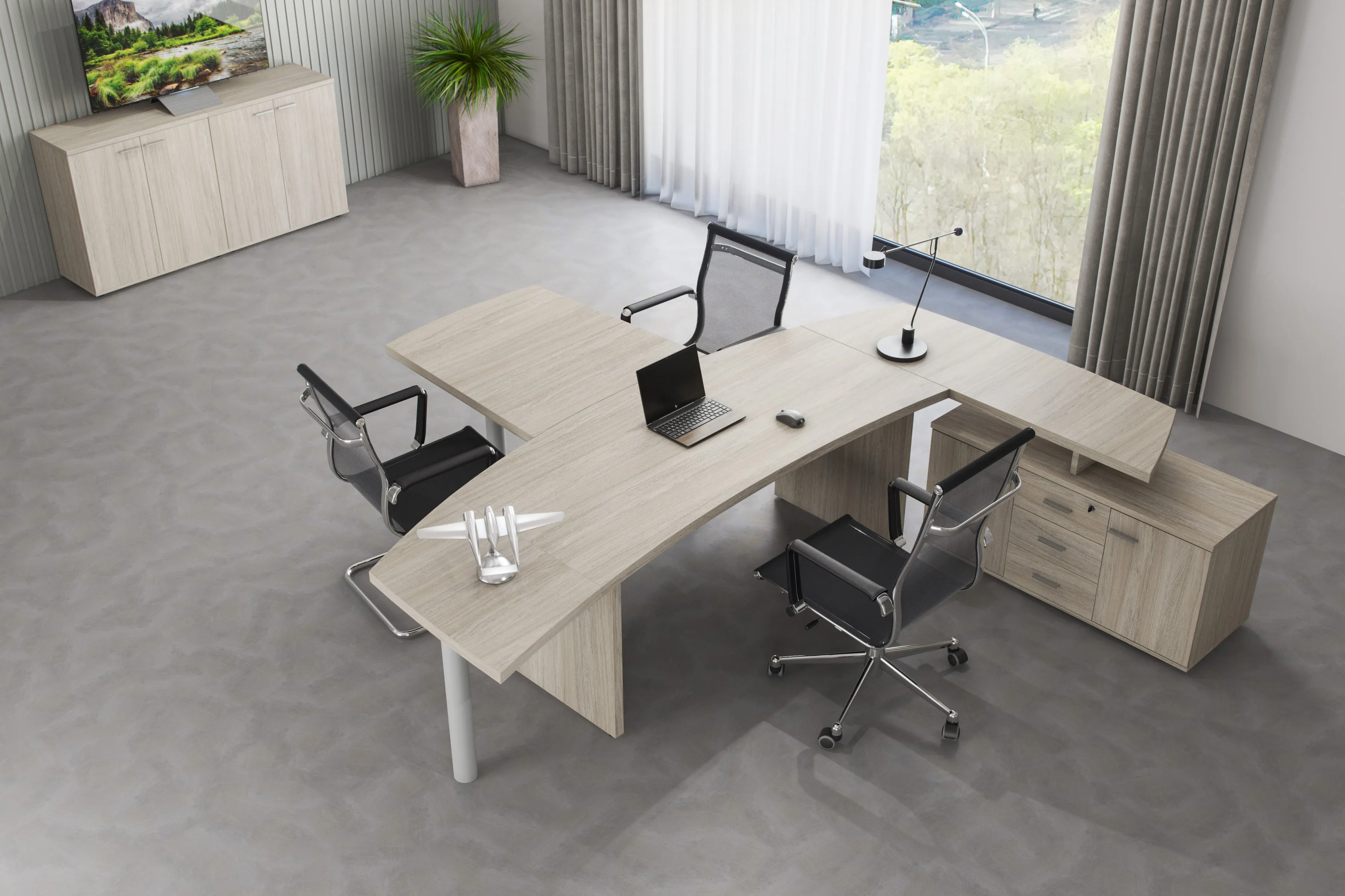 Кабинет WING - это символичное сочетание традиционных материалов для изготовления мебели с уникальными нелинейными формами столешницы кабинет. Кабинет для руководителей WING отражает современные взгляды на офисную мебель. Оригинальный дизайн кабинета подчеркивается уникальной формой столешницы, которая тяготеет к форме крыла. Это не только исключительная особенность дизайна, но и её функциональная составляющая, обеспечивающая присоединение дополнительных рабочих поверхностей в виде боковых приставок нелинейной формы, а также традиционного брифинга.